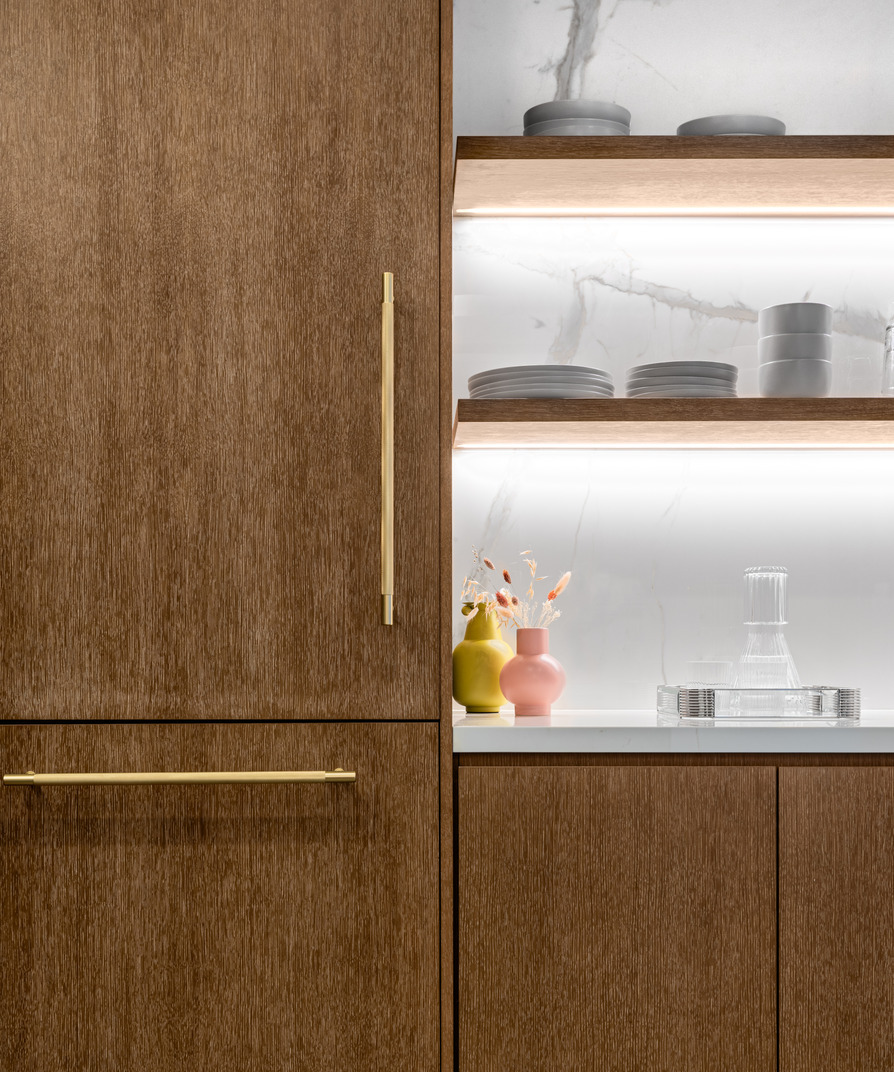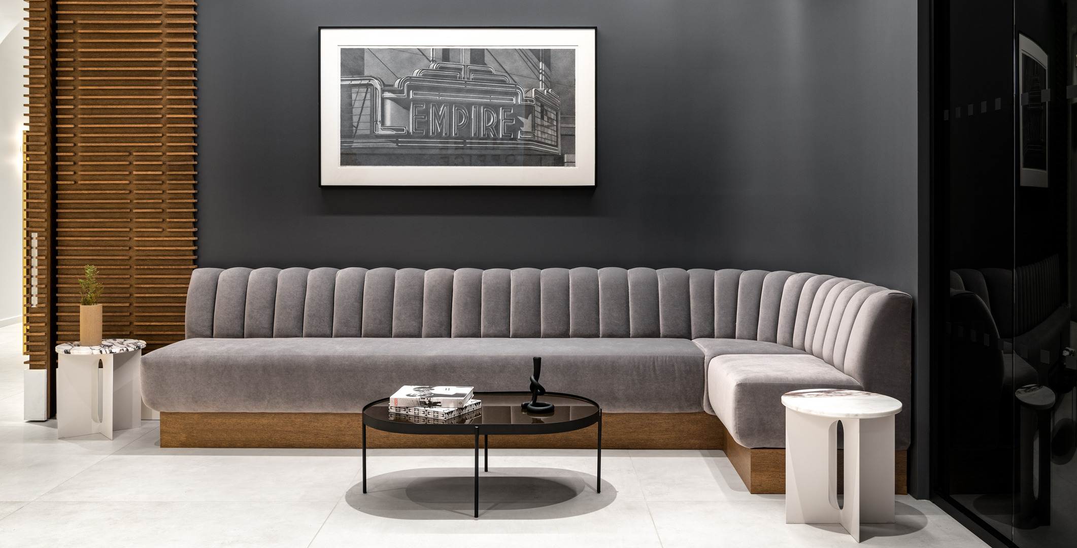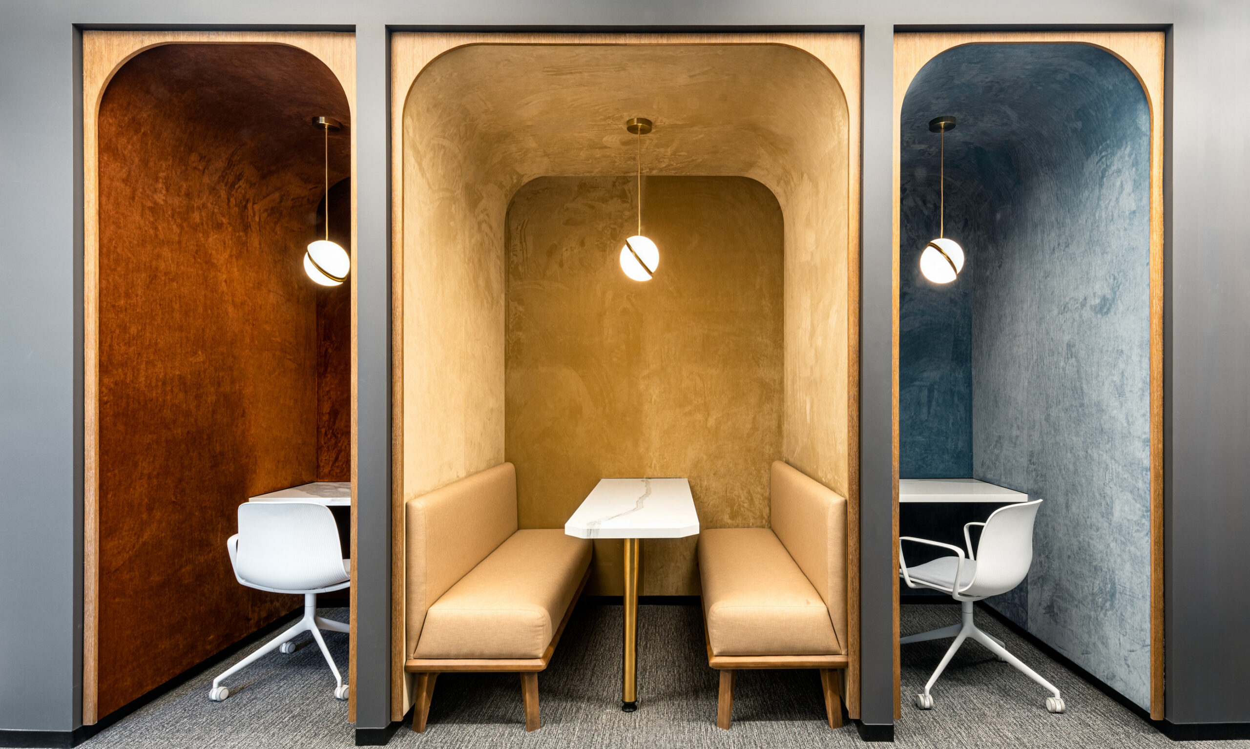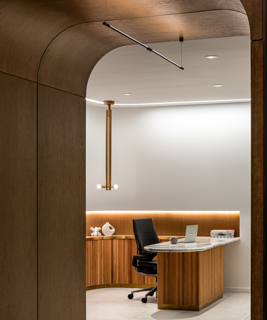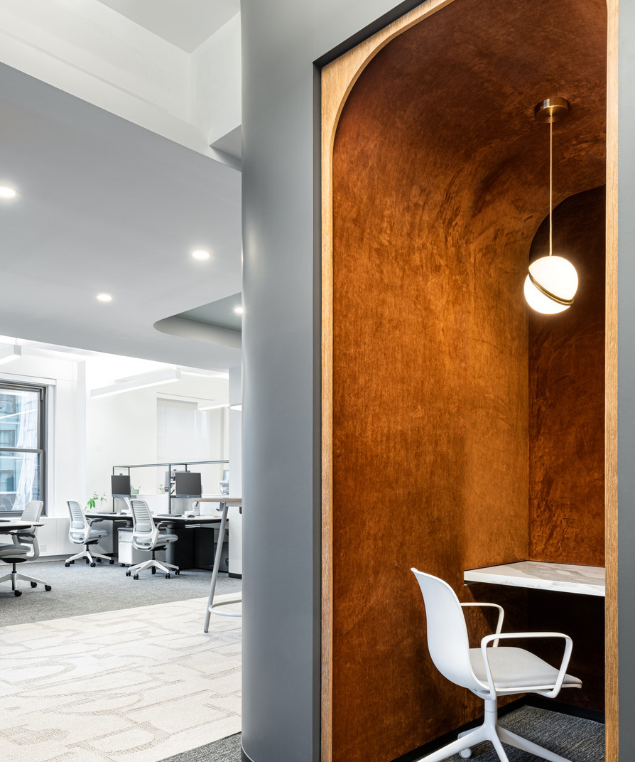 Empire’s custom millwork division, Fabricate, crafted one-of-a-kind furniture and built-in solutions that blend with the furniture selections for a unique but uniform look and feel. Fabricate’s engineers developed shop drawings based on the conceptual renderings from the VMAD team and sourced multiple material samples to match the furniture in the space. Signature pieces include large-scale sliding entry doors, a custom stone reception desk, upholstered benches and banquettes, custom velvet-wrapped work pods, built-in pantry cabinetry and stone tops, and a curved wooden portal.