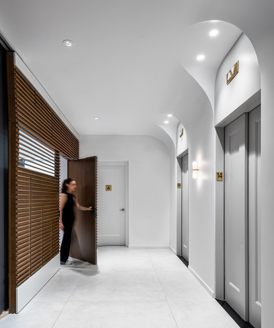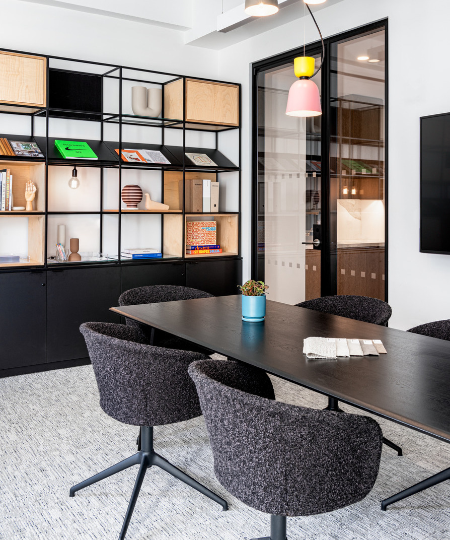 The style of the space is Scandinavian-modern, reflected in impressive marble stone slabs, arched doorways, rich velvets, wood slats, brass accents, and a sophisticated color palette with over a dozen brands represented, including Steelcase, Coalesse, Stylex, Watson, Allermuir, Andreu World, Hem, Menu, Viccarbe, Nucraft, Spacestor, Heartwork, Minotti, Tuohy, West Elm Work, and many more.