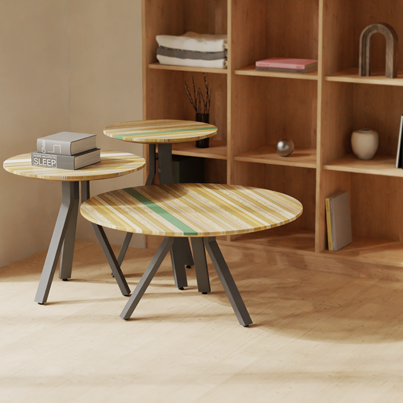 The retreeve Tables Collection from BOLD Furniture includes innovative, sustainable statement pieces that champion a circular economy and environmental responsibility. Displaying striking butcherblock surfaces, the retreeve Tables Collection is resourcefully crafted from recycled solid wood, MDF, particle board, and plywood, all recovered from BOLD Furniture’s own manufacturing scraps. This direct reuse of industrial materials in the table designs not only reduces waste but also supports a circular economy, minimizing the environmental impact of the manufacturing process.