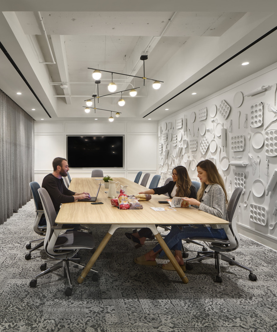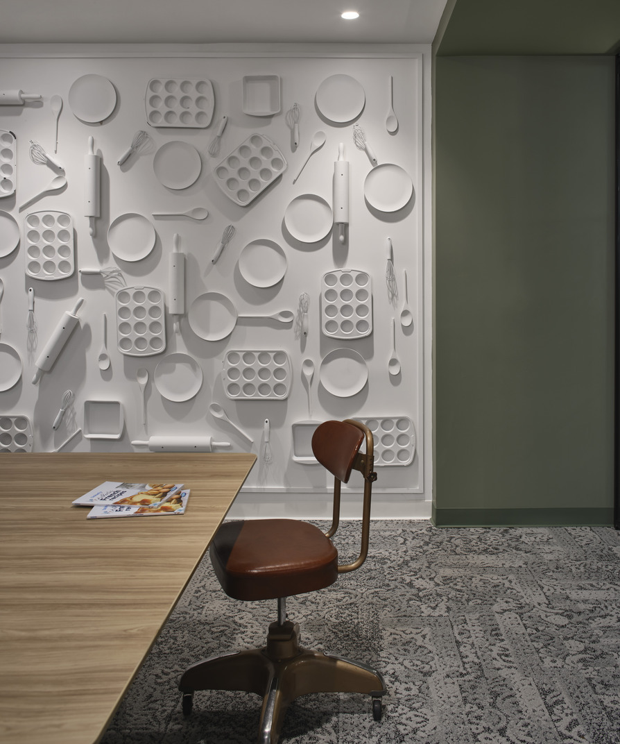 In partnership with Interior Architects, our teams worked together to provide unique design features for Bakerly’s new space, such as a three-dimensional utensil mural and rolling pin room divider.