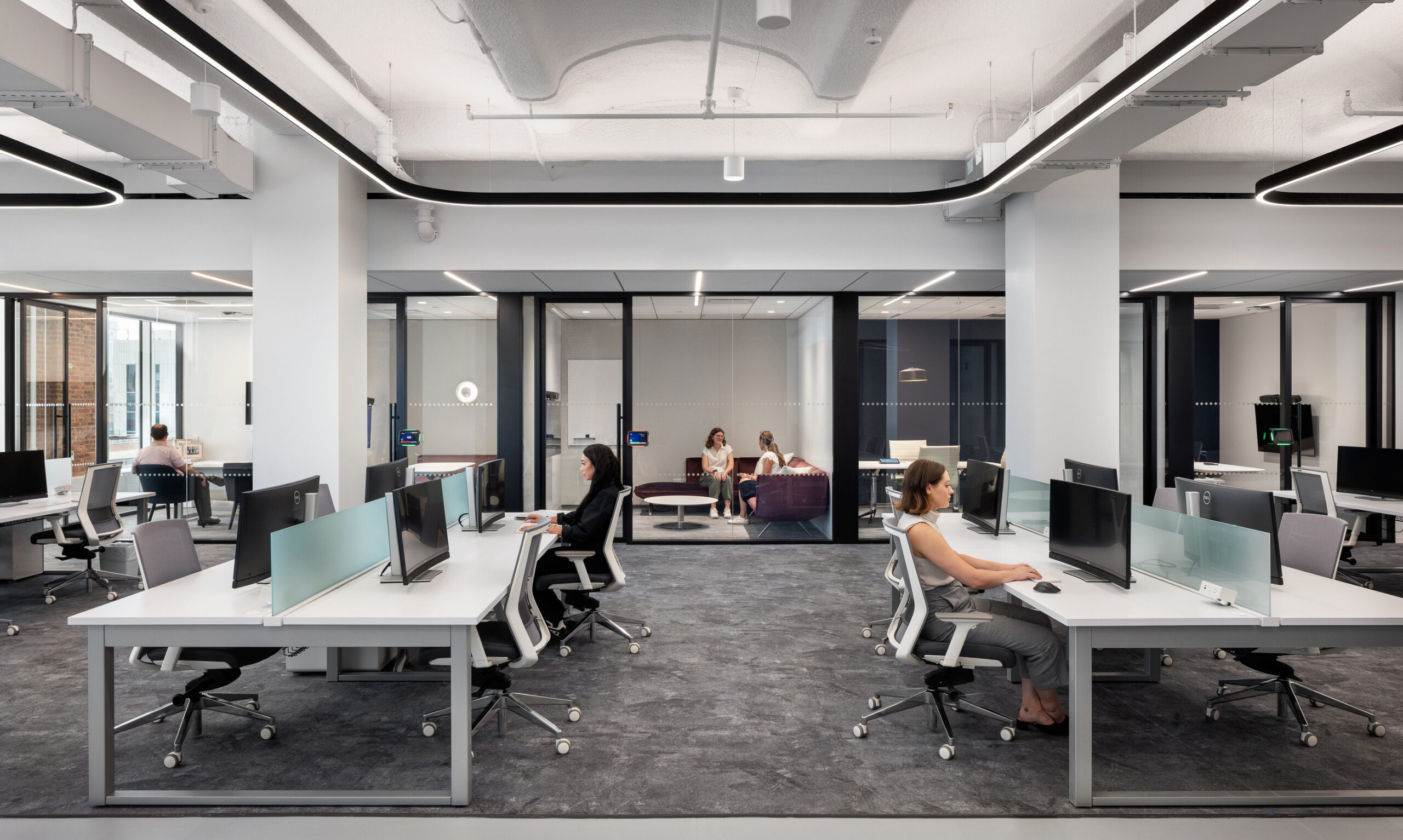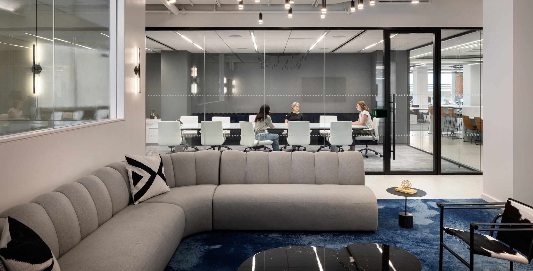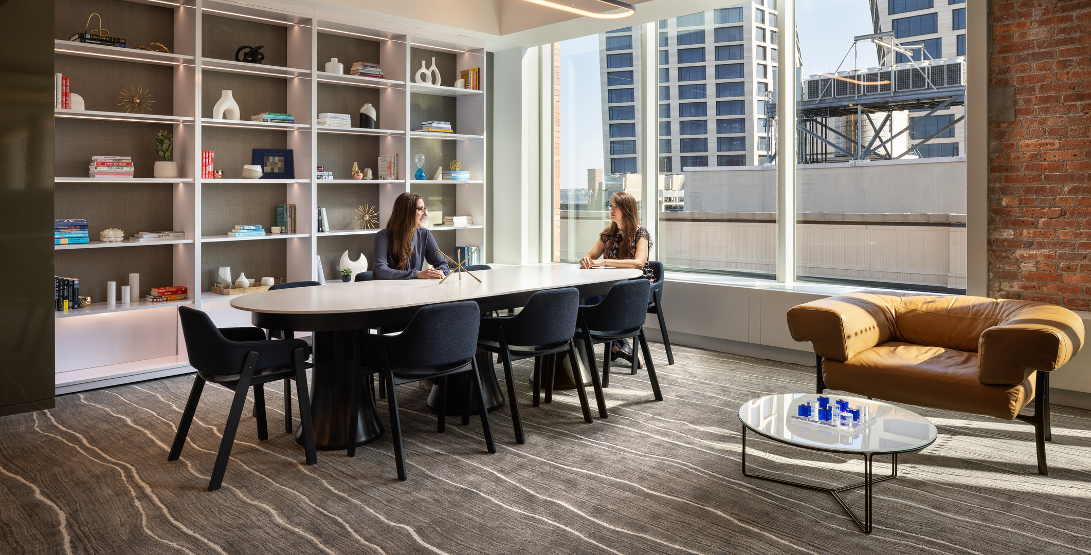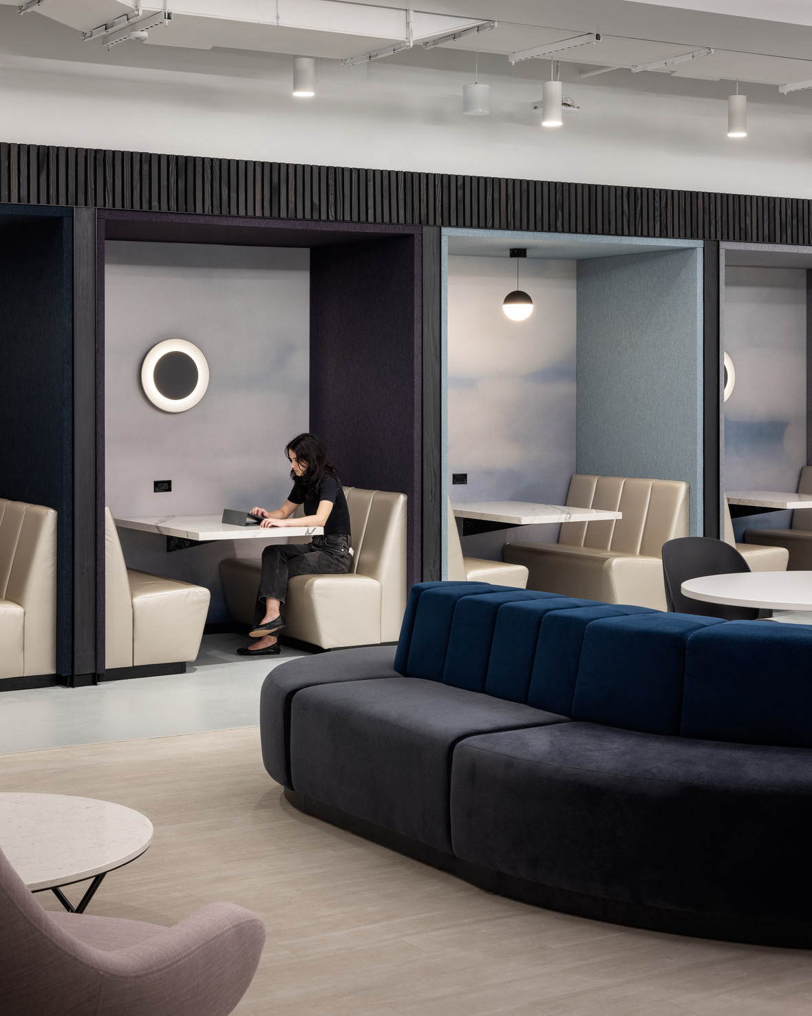 Empire’s Creative Studio led the iterative design process with TPG, creating a furniture lookbook, an alternates package, a budget spreadsheet, and photo-realistic renderings to bring the vision to life. Empire sourced furniture from over 30 manufacturers, including Arper, Viccarbe, Stylex, Davis, Bernhardt, Wilkhahn, and Gubi. The workspace features AIS Oxygen benching, which complements the open, collaborative nature of the office and supports employees’ evolving workstyles. Empire’s custom millwork and furniture provider, Fabricate, played a key role in translating the company’s brand and culture into the space. They expertly crafted bespoke pieces that off-the-shelf furniture couldn’t achieve. This custom package includes banquettes, lockers, bookcases, tables, credenzas, stadium seating, the stone reception desk, and much more.