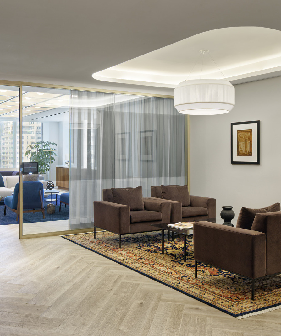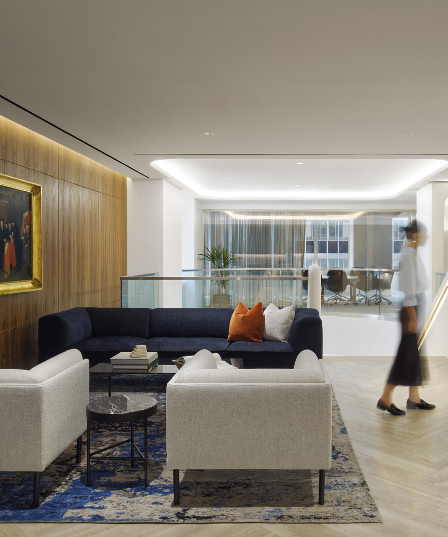 The Empire Creative team procured contemporary accessories, textiles, and furniture to complement the distinctive vintage client-owned pieces, tastefully woven throughout 120,000 feet of workspace.