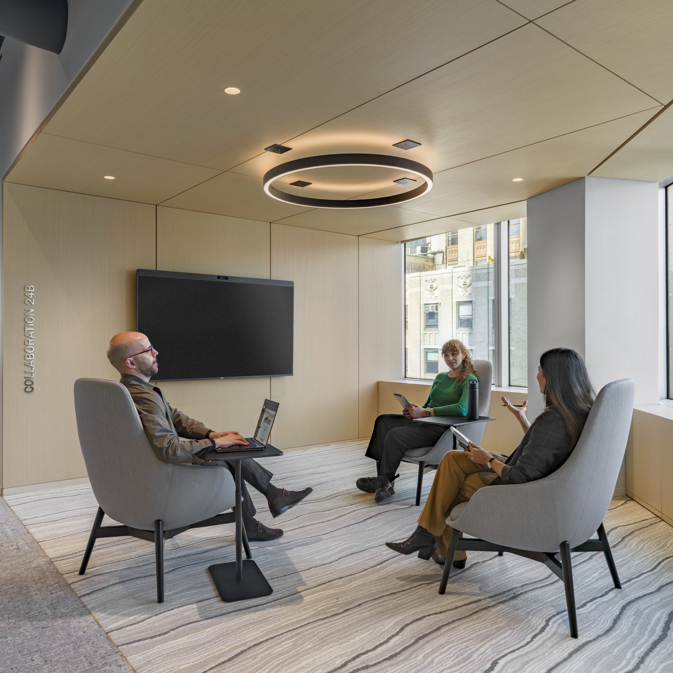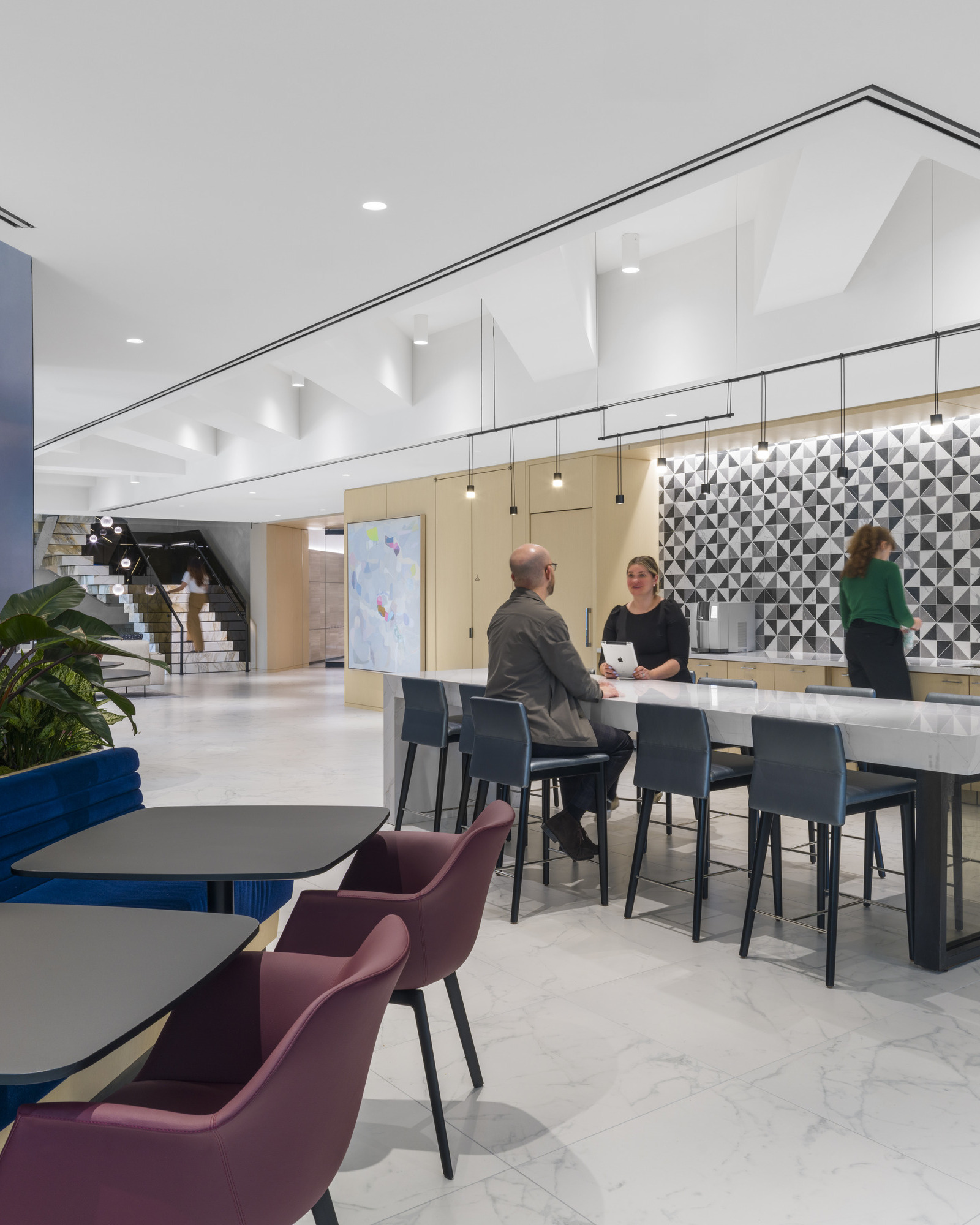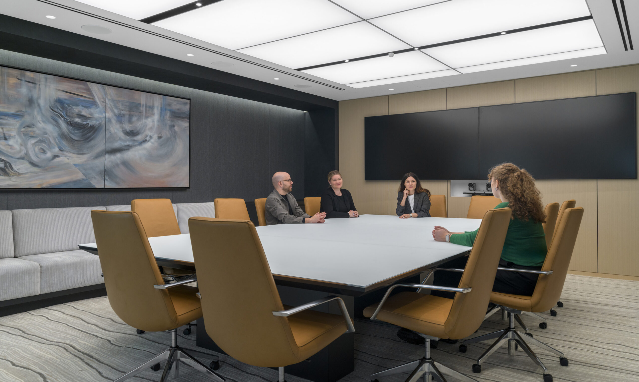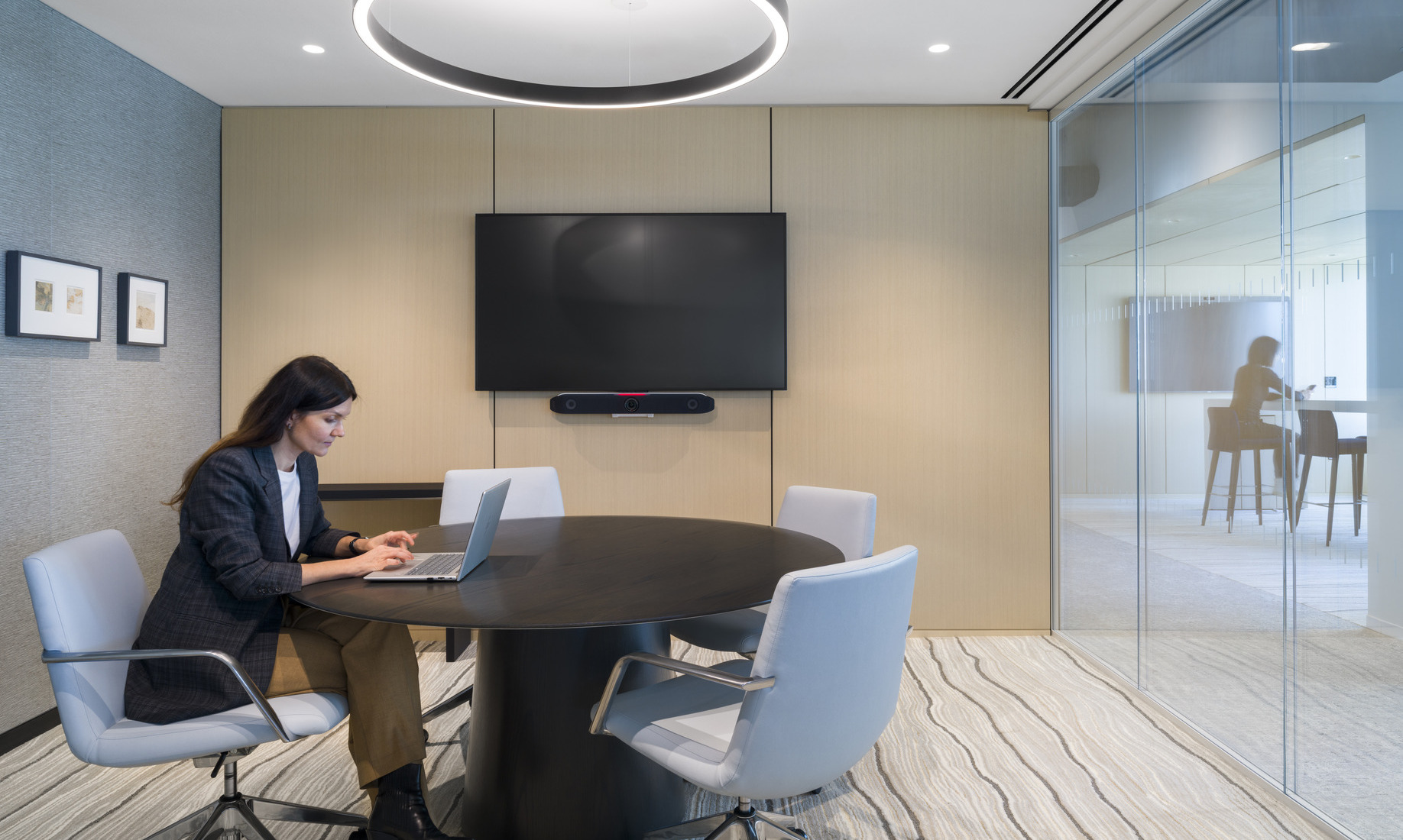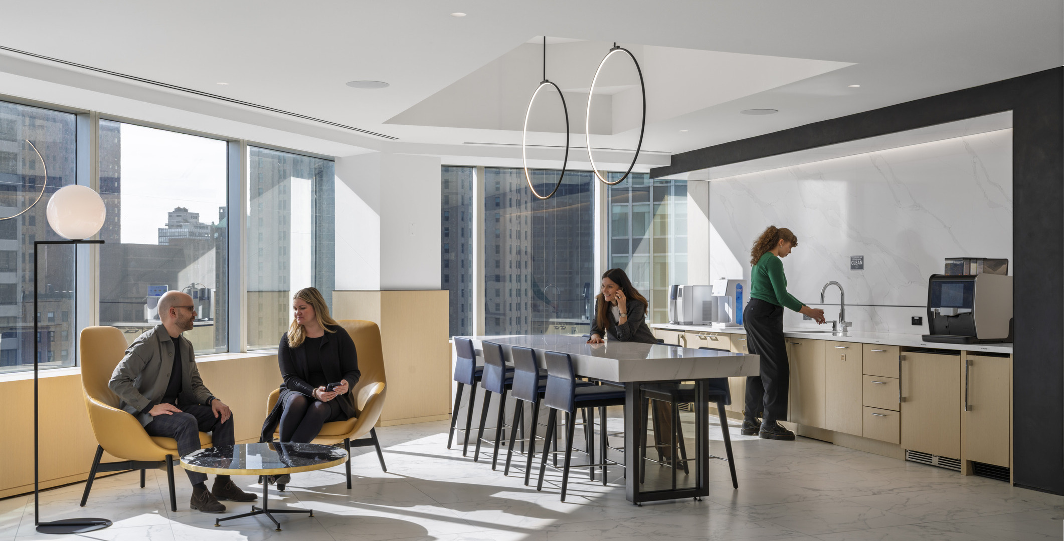Cafés and collaborative touchdown areas were distributed throughout all four floors to support a range of work styles. Conference rooms and stations required additional coordination to support the client’s technology-forward approach, incorporating custom conference tables and Humanscale monitor arms with integrated charging solutions and concealed wiring.