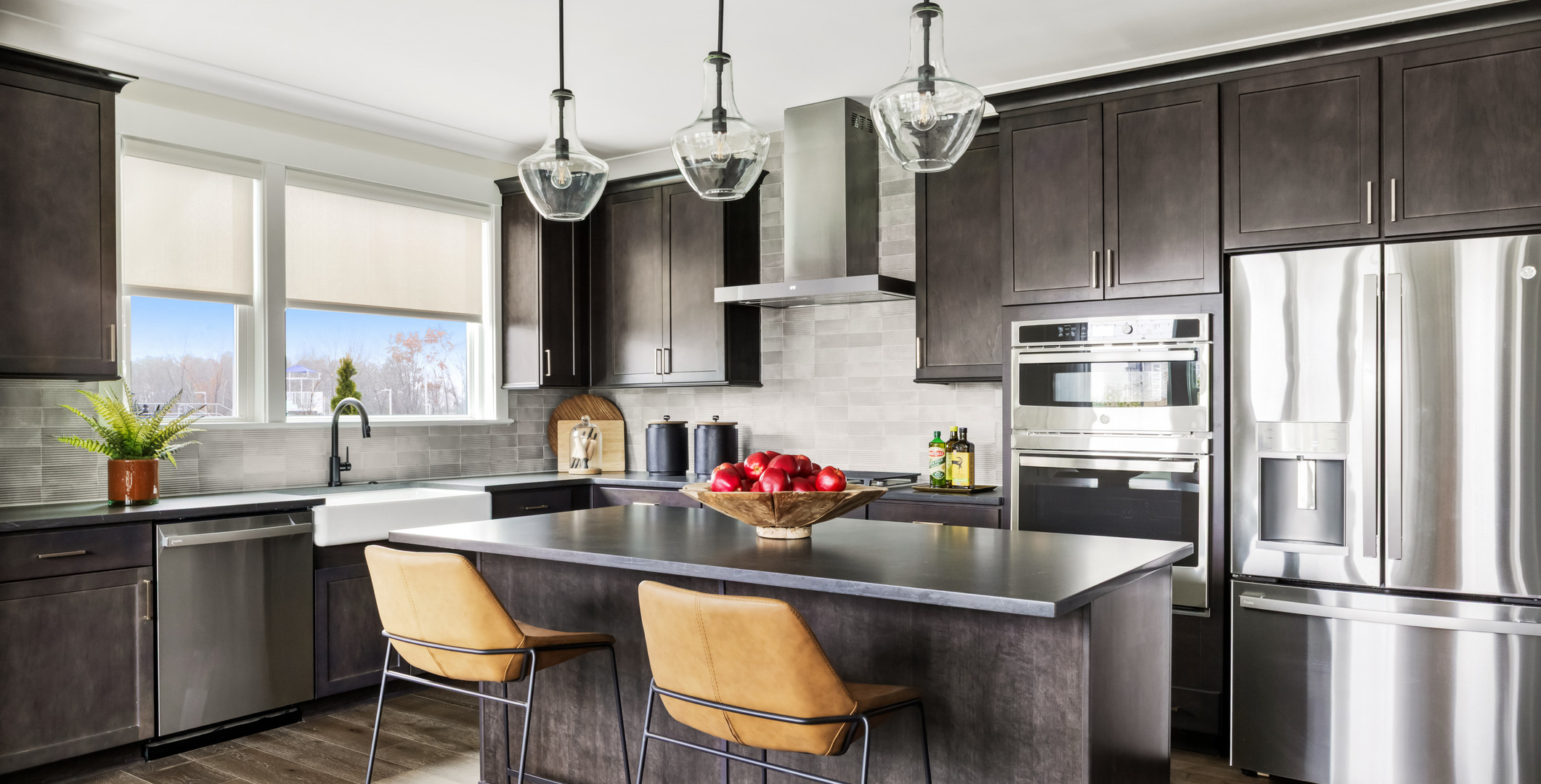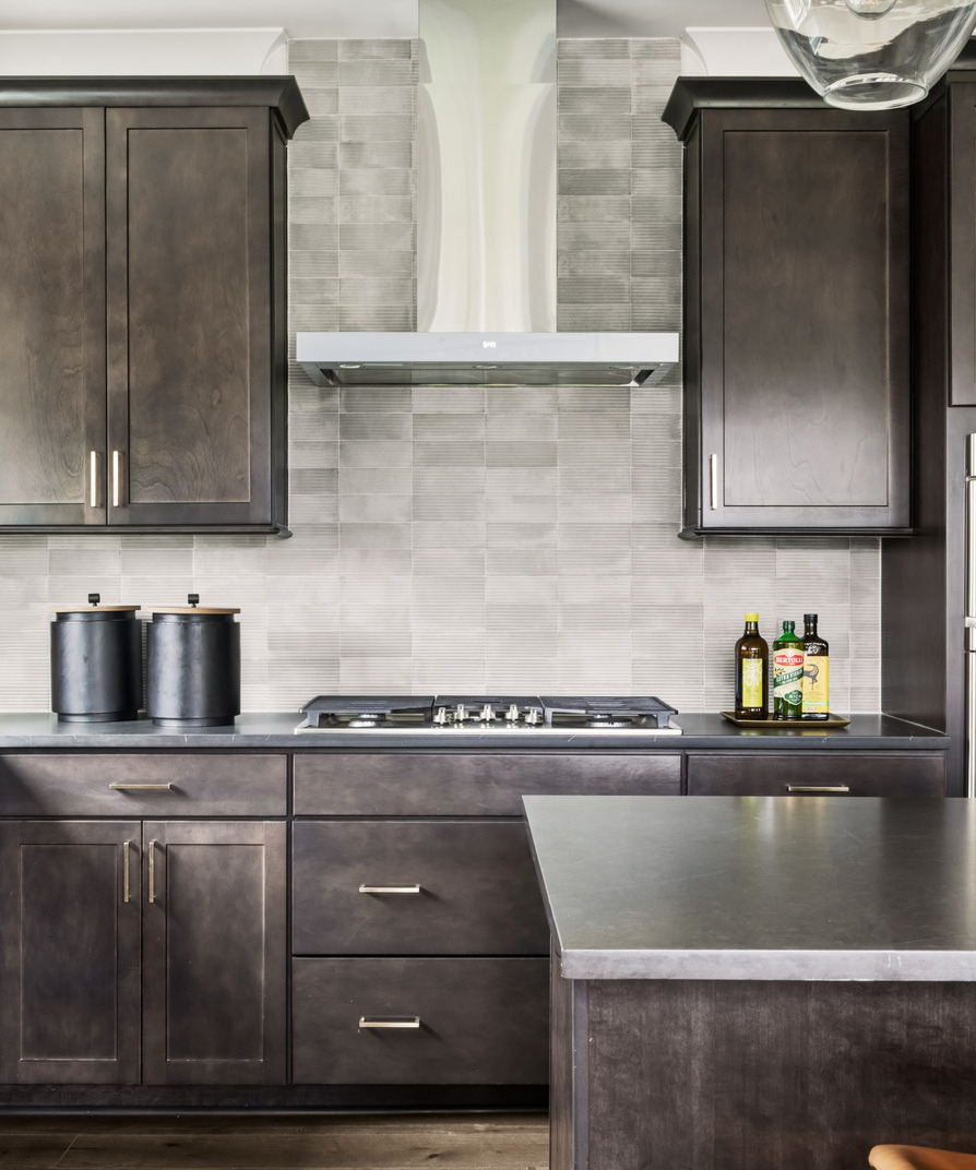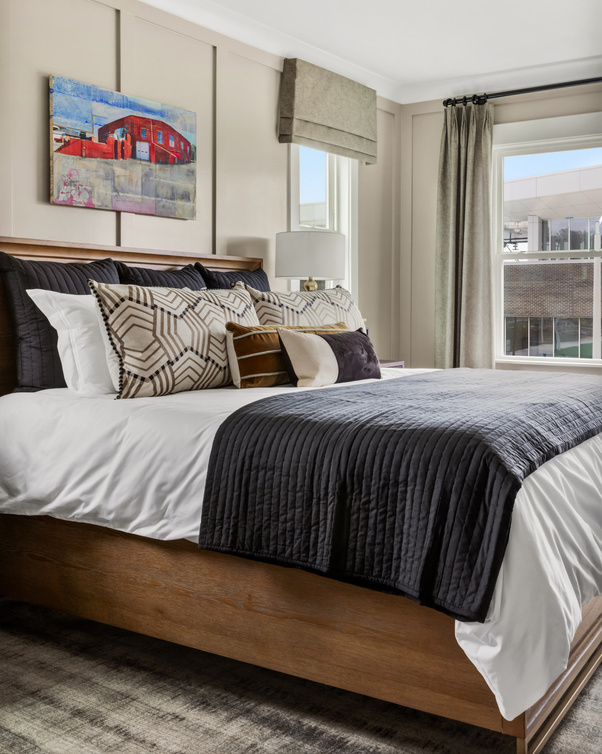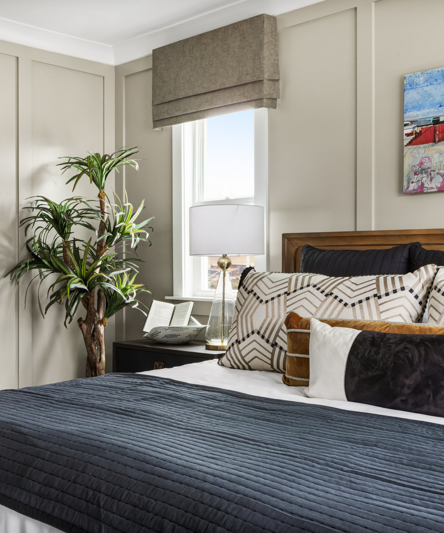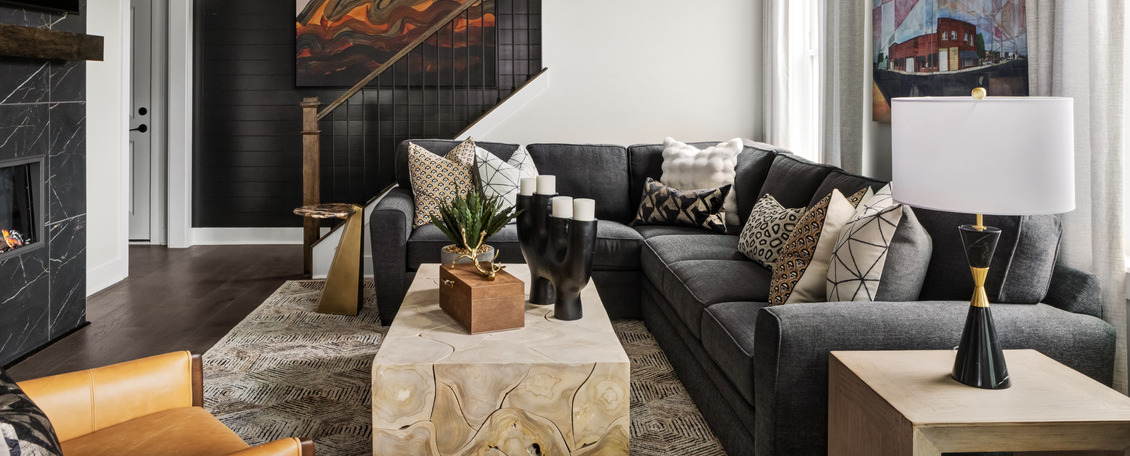 The interior palette remains grounded in warm neutrals, layered with hints of orange, rusted red, and soft gold to introduce depth and character. Clean-lined furnishings and warm wood tones keep the home feeling modern yet approachable. Furnishings, rugs, and art were sourced from manufacturers including Legacy Classic Furniture, Martin Furniture, Jonathan Louis, Uttermost, Four Hands, Crestview Collection, Magnussen Home Furnishings, Loloi, and Leftbank Art.