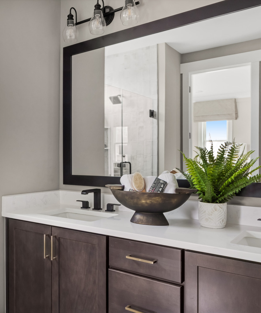 Material detailing plays a central role in defining the home’s character. A marble fireplace anchors the living room as a natural focal point, while shiplap along the staircase introduces texture and subtle architectural movement between levels. Local Raleigh artist pieces were incorporated at the builder’s request, creating a meaningful connection to the surrounding community. Rather than serving as decorative add-ons, the artwork was intentionally placed to reinforce a lived-in, personal atmosphere.
