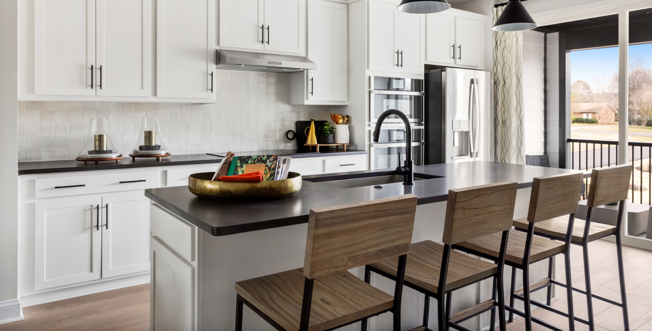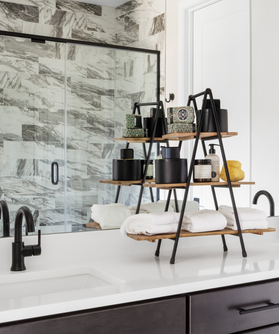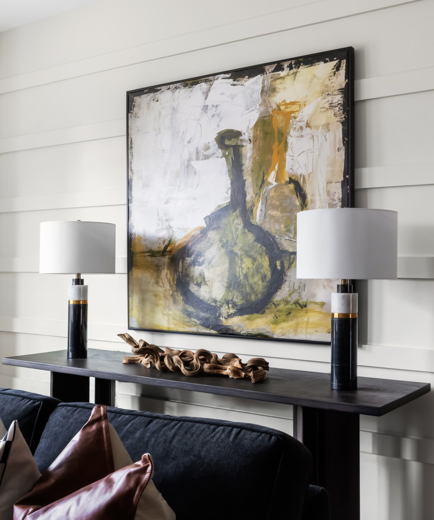 A black-and-white foundation is elevated through subtle contrast and controlled pops of green, creating visual interest without relying on heavy patterns or color saturation. The result is a palette that feels calm, tailored, and highly livable for a professional buyer.