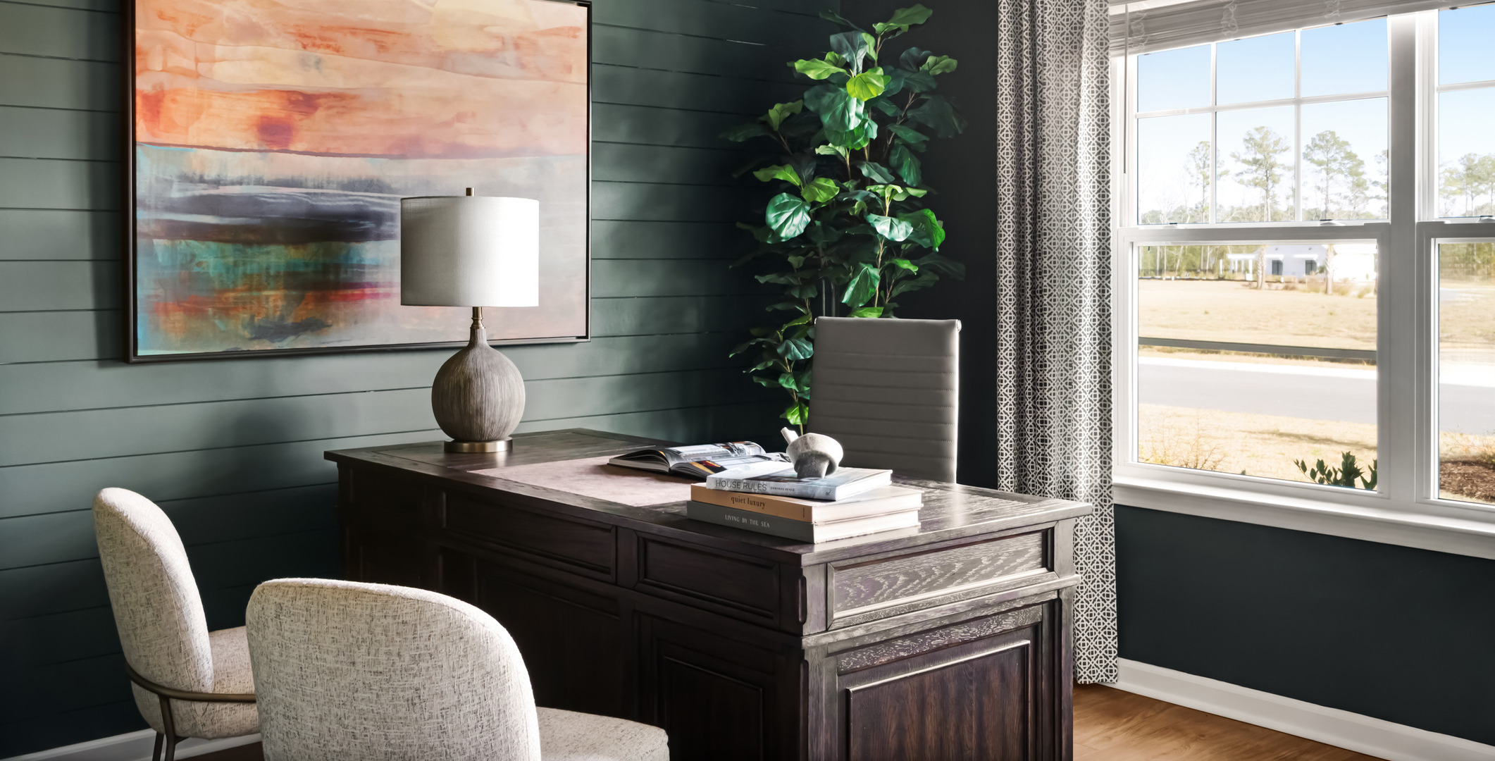 A neutral foundation is layered with intentional accents of warm greens, rust tones, and subtle pops of red and orange. Every detail—from lighting to hardware—was carefully selected to balance elevated finishes with practical, cost-conscious choices. Key spaces include the dining area and a front bedroom styled as a functional and inviting home office, incorporating locally inspired artwork that adds a coastal touch and connects the home to Wrightsville Beach, just 30 minutes away.
