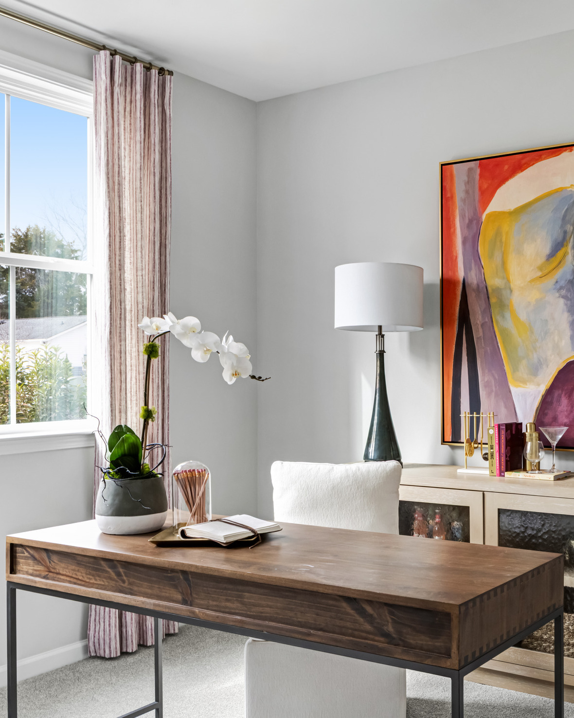Custom elements were used selectively to define key moments throughout the home. Bedroom #2 features a trim accent wall that elevates the space for guest use, while wallpaper in the family room introduces soft texture and dimension. The home office was designed with a travel-inspired theme, reinforcing the lifestyle of the target buyer and adding a personal, curated layer to the home.