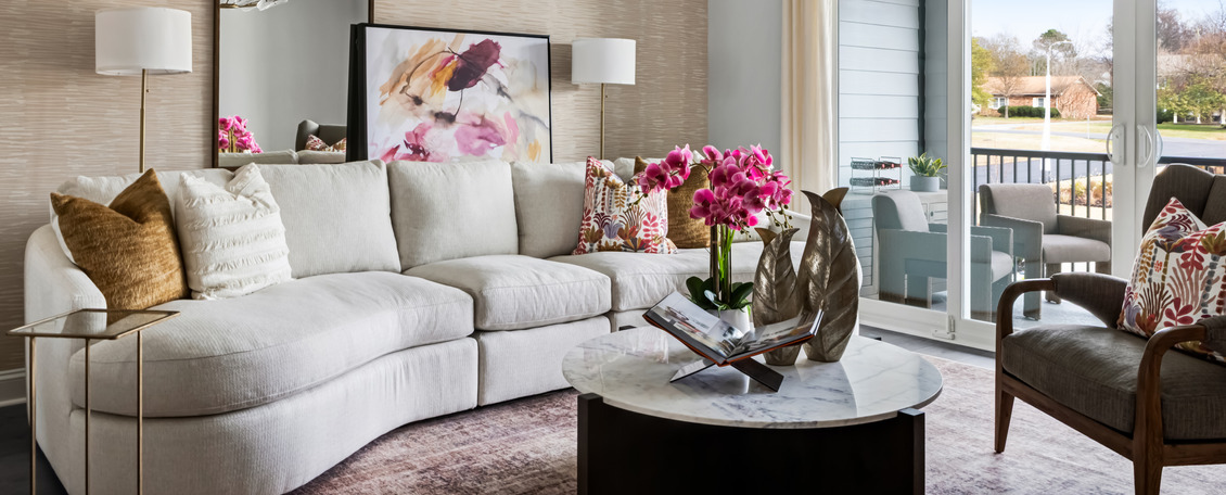 Highlighted spaces include the living room, primary suite, and guest bedroom. The home features furnishings and décor from manufacturers including Four Hands, Riverside, Uttermost, Craftmaster, Parker House, Aspen Home, Rosenthal & Rosenthal, Loloi, Leftbank Art, Stylecraft , and Dovetail. The final design delivers a refined, feminine townhouse that feels tailored, flexible, and highly livable.