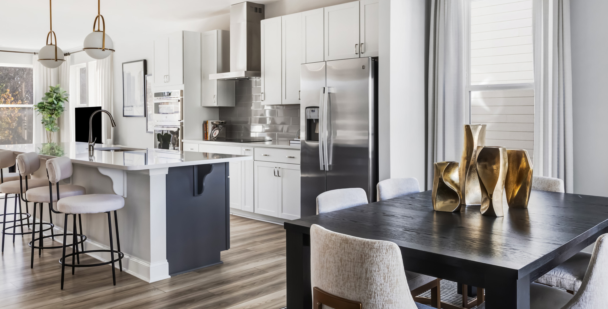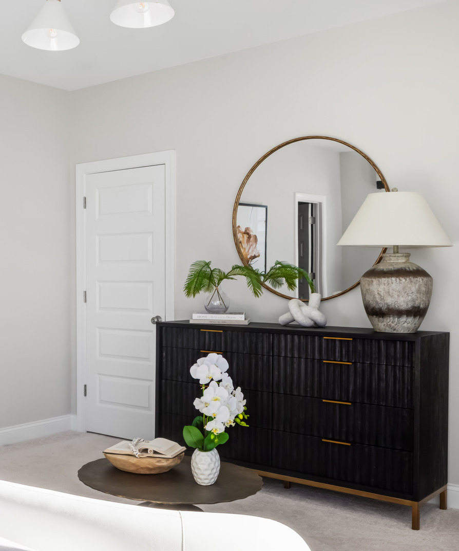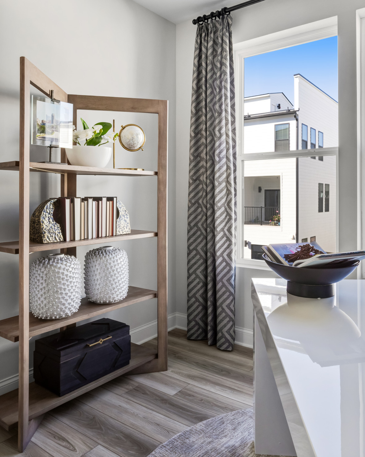 The interior blends clean modern lines with a softer transitional feel. A foundation of crisp whites and layered greys establishes a calm, contemporary backdrop, while green accents introduce freshness and subtle energy. Intentional “memory points” appear throughout the home—from statement wall treatments to curated art groupings—creating moments that feel distinctive without overwhelming the space. A dedicated home office with custom wallpaper offers an urban, work-from-home setting, while tailored trim detailing adds character to a guest bedroom. The primary suite and rooftop terrace were treated as highlight spaces, designed for both retreat and gathering.