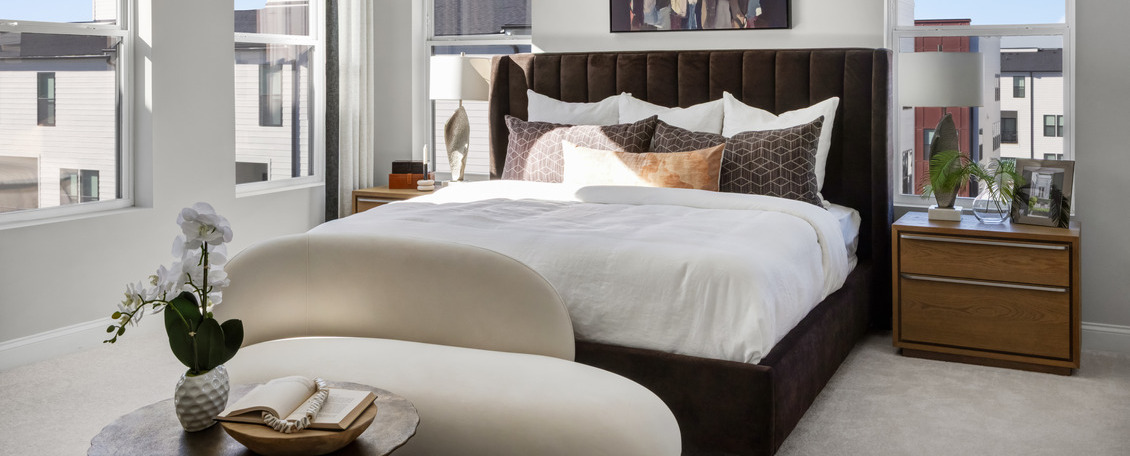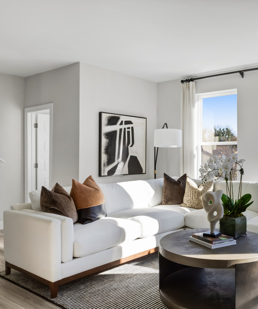 Furnishings, rugs, and art were sourced from manufacturers including Jonathan Louis, Four Hands, Zuo Modern, Legacy Classic, Mercana, Modus, Uttermost, TOV Furniture, Loloi, Leftbank Art, and Stylecraft. The result is a modern, flexible condo that feels equally suited for focused work, connected city living and effortless entertainment.